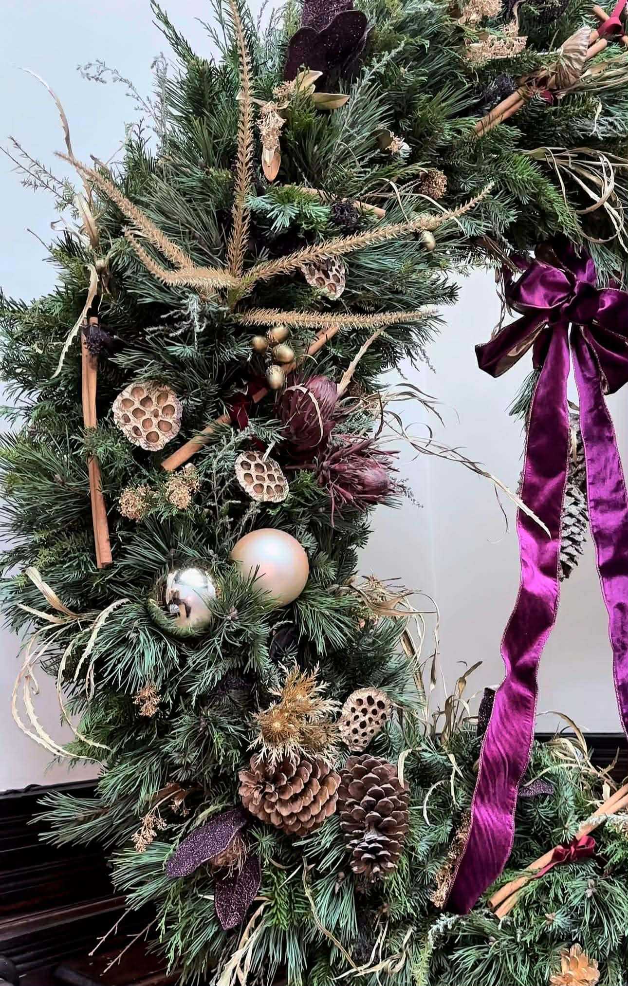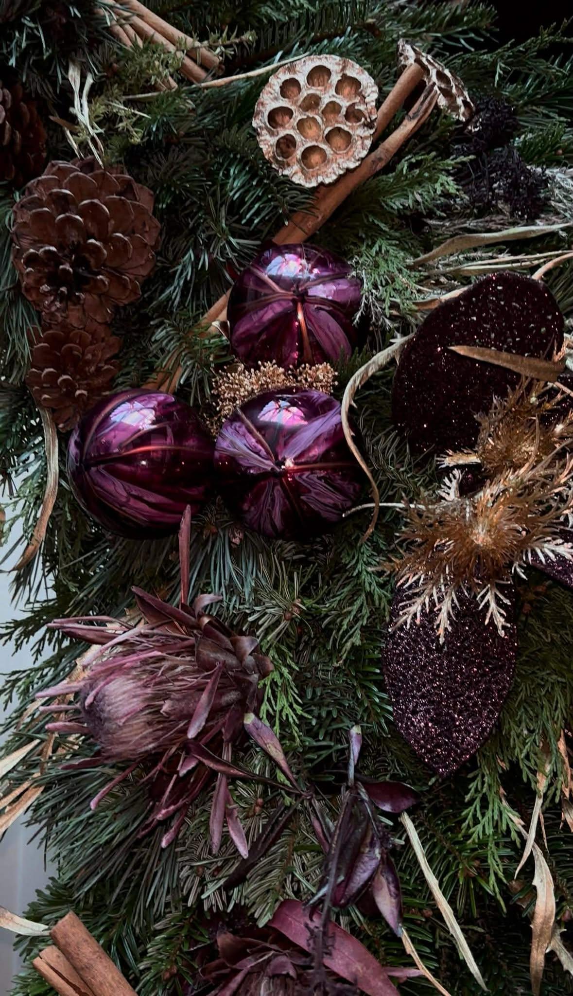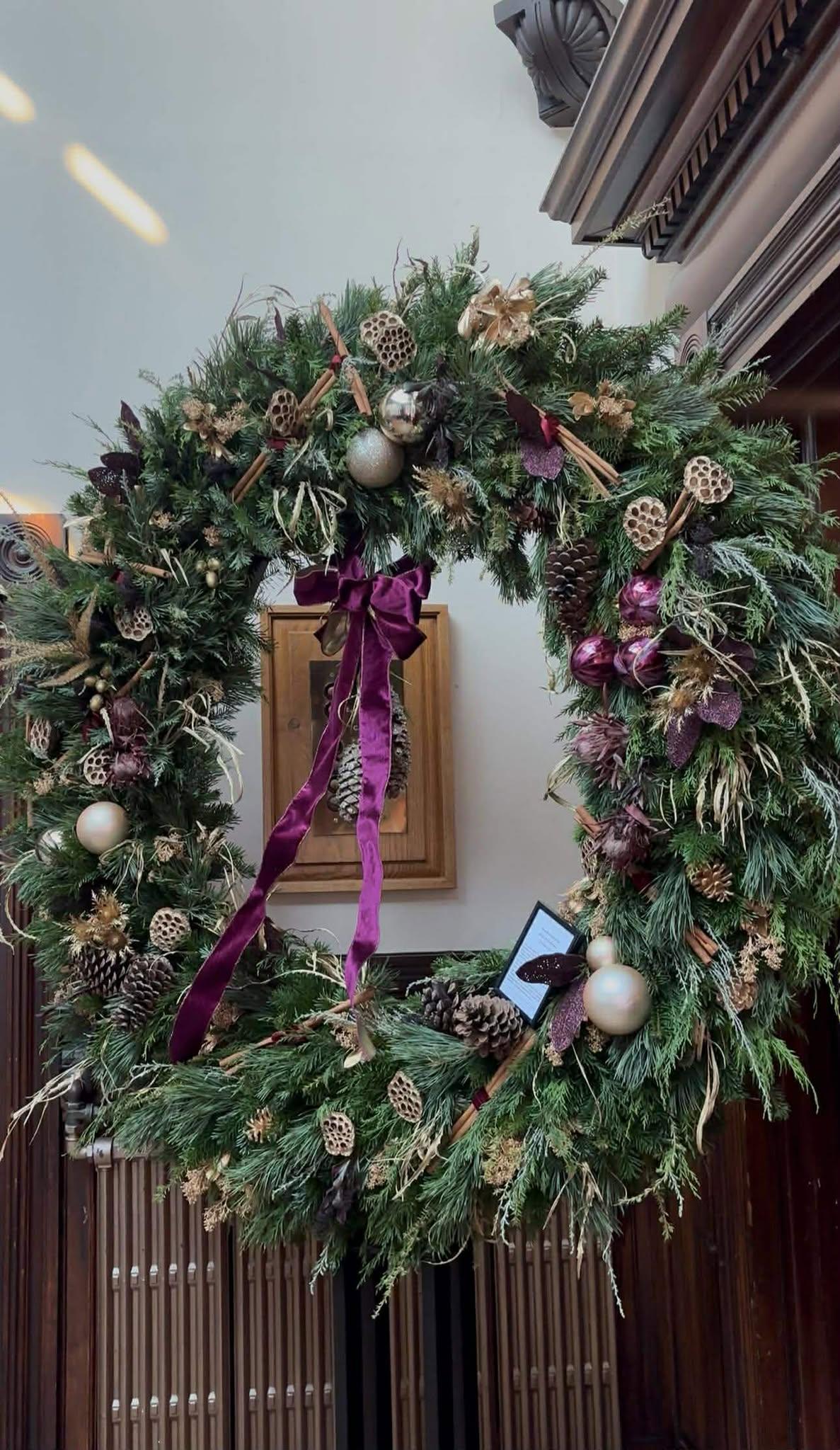 The wreath took 4 days to build and the fresh greenery is a stunning mix of Conifer, Pine, Spruce, Silver Sussex, Loutis heads, Skimmia, Protea from South Africa and fabulous oversized cinnamon. The fresh Skimmia is gold.